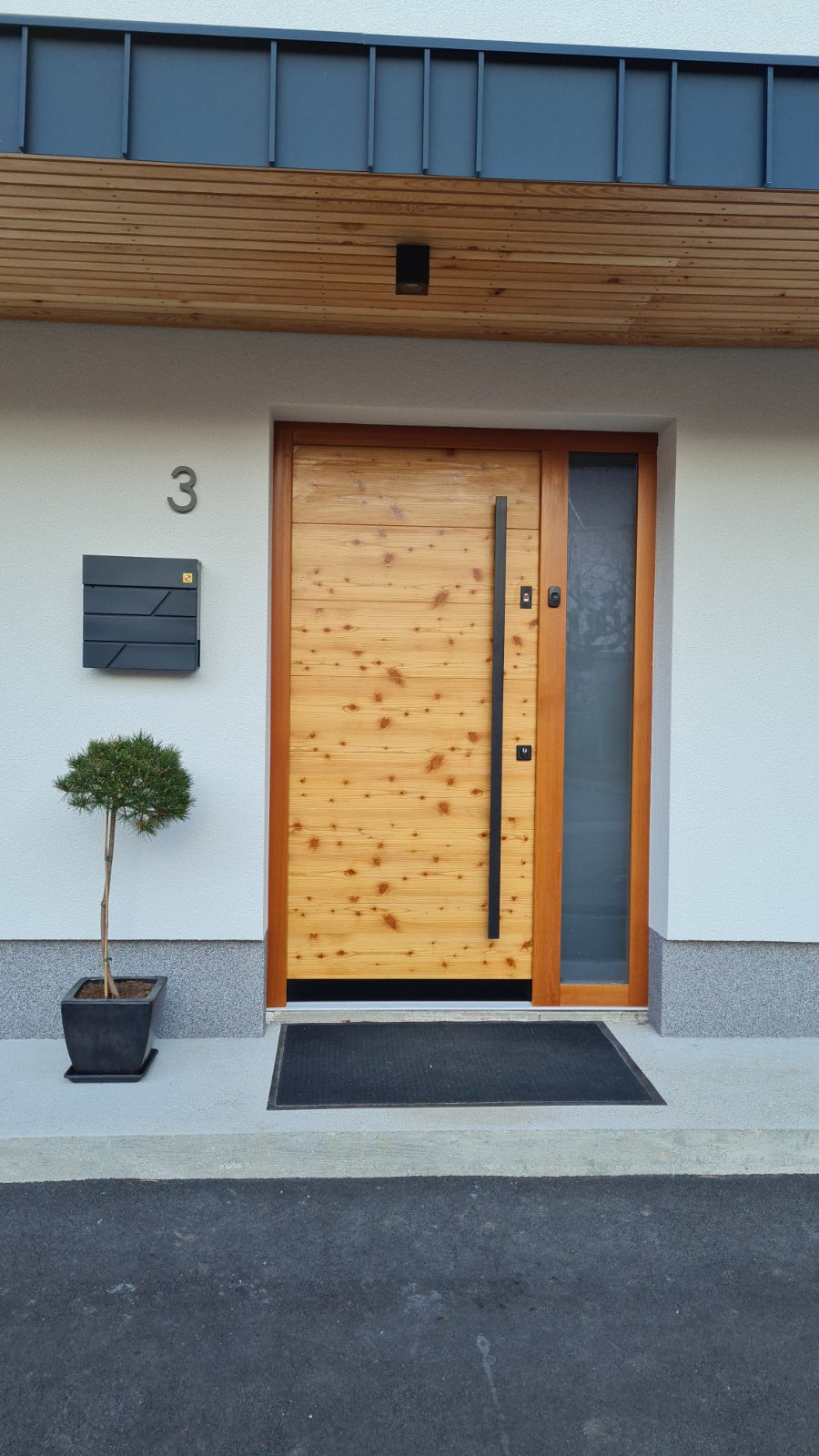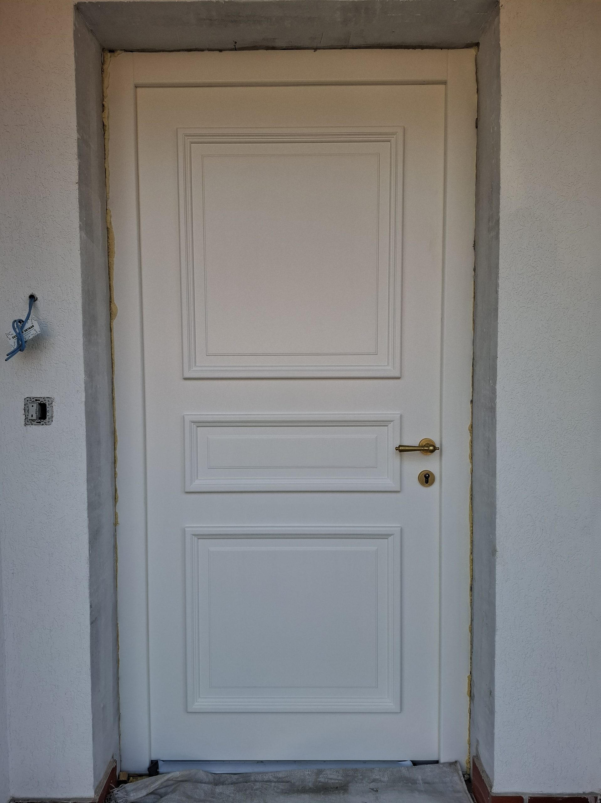 Obdelava vhodnih vrat temelji na najnovejši tehnologiji: vsa vrata vsebujejo 2- krat tesnilo na krilu in 1-krat na okvirju. Na spodnjem delu okvirja vgrajujemo pohodne termo distančnike. Lakirana so na vodni osnovi REMMERS, lahko pa jih zaščitimo tudi na oljni osnovi.